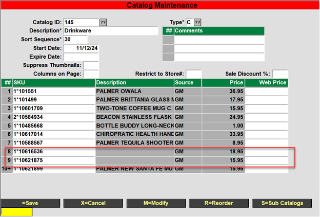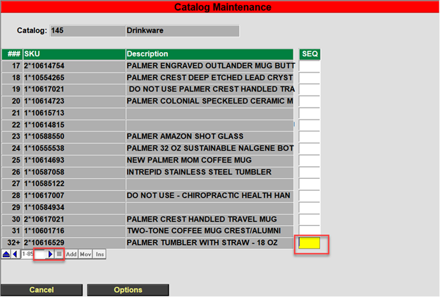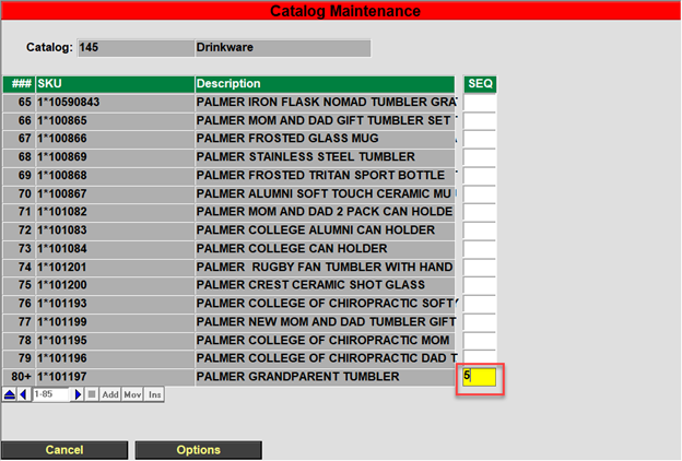 - Bring up the catalog that you wish to change the SKU order for by going to POS.26.2 and then bring up the correct catalog.